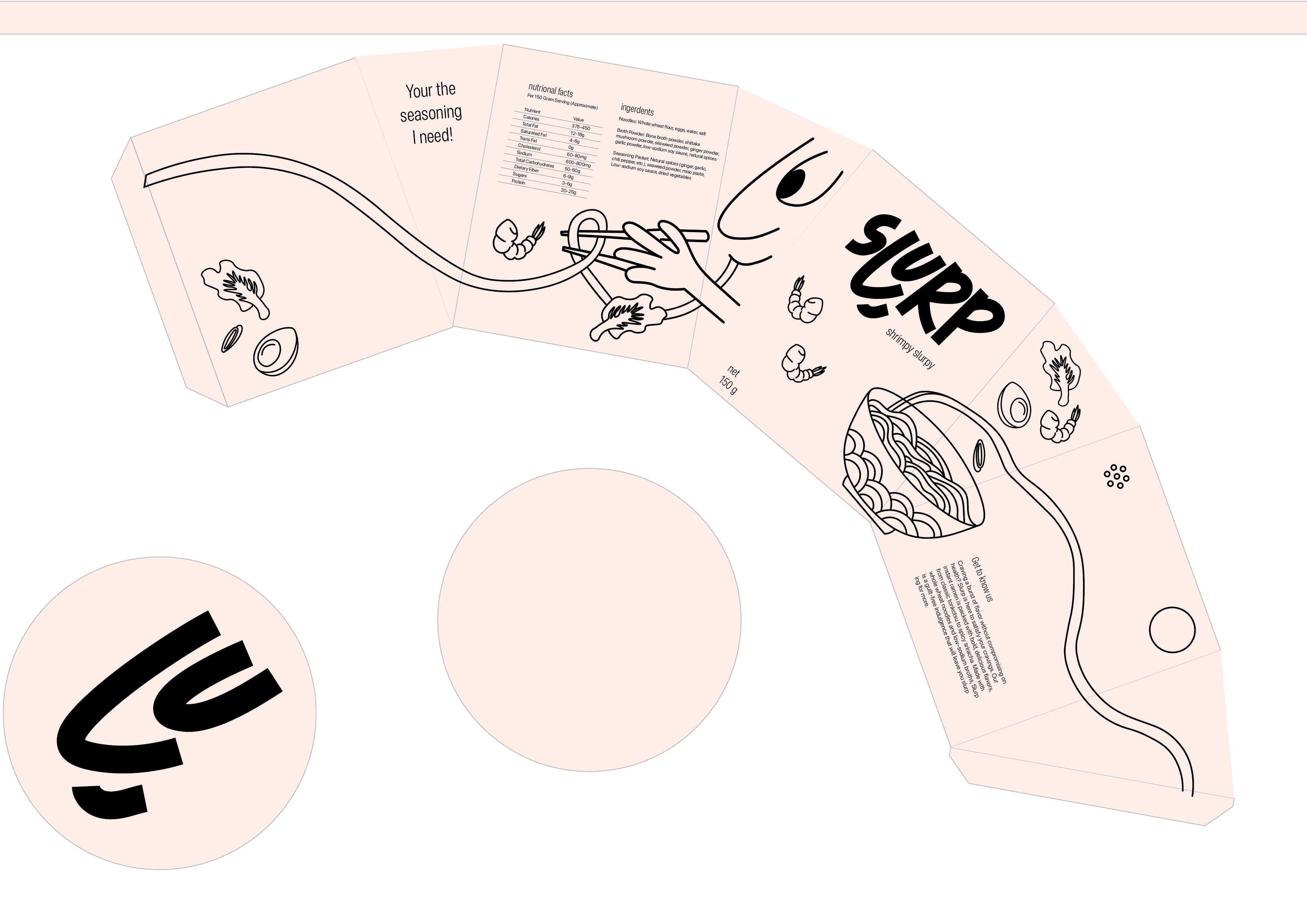 SLURP is a sustainable, all-in-one packaging redesign that transforms the instant noodle experience through clever engineering and playful, doodle-style graphics. The biodegradable thermal cup unfolds from a cylinder into a wide bowl and features pressable seasoning compartments in the lid to eliminate plastic packet waste. With smart details like a heat-sensitive readiness sticker, drainage holes, and built-in chopsticks, SLURP creates a seamless, eco-friendly ritual for the modern consumer.